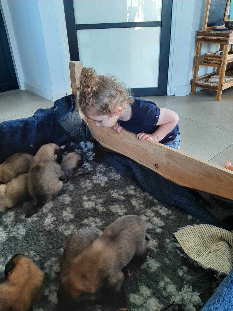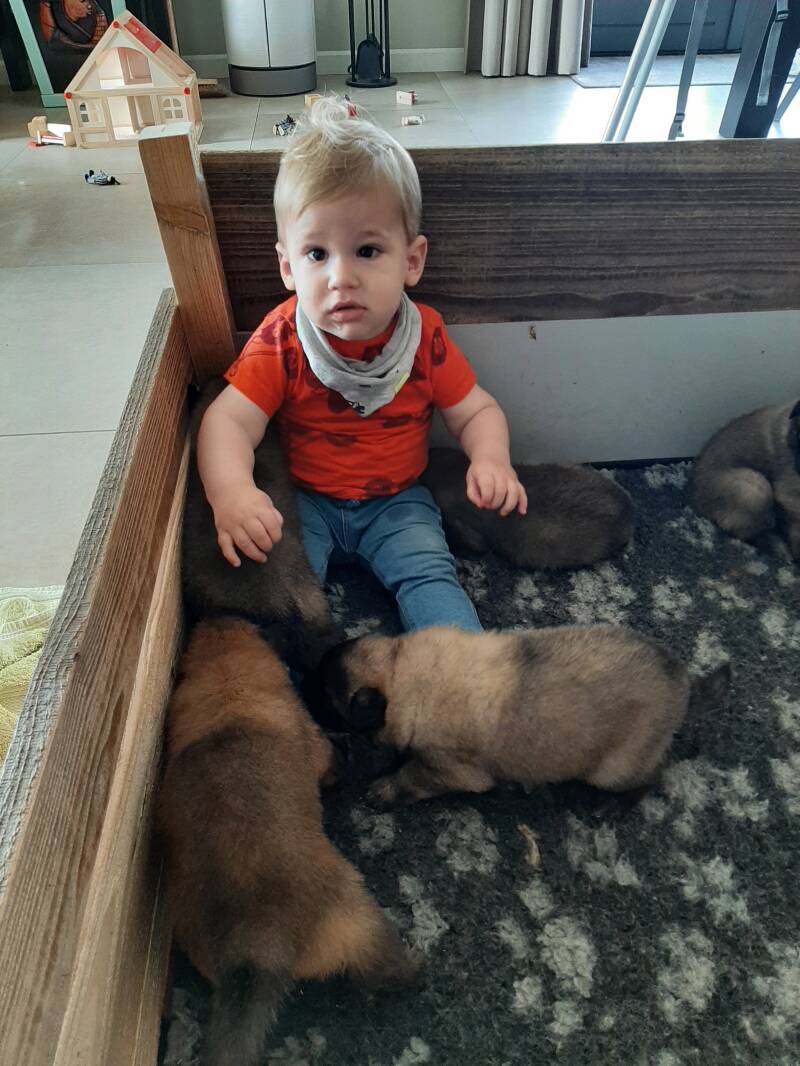 Wij hebben zelf 8 kleinkinderen waar Dunja heel goed mee overweg kan. De reu Whiskey en Dunja zijn beiden sociale honden, maar willen ook graag werken. Een tervuerense herder houdt van sporten, behendigheid en lange afstandslopen. Ze luisteren goed, zijn gehoorzaam en sociaal. Het zijn echte familiehonden.